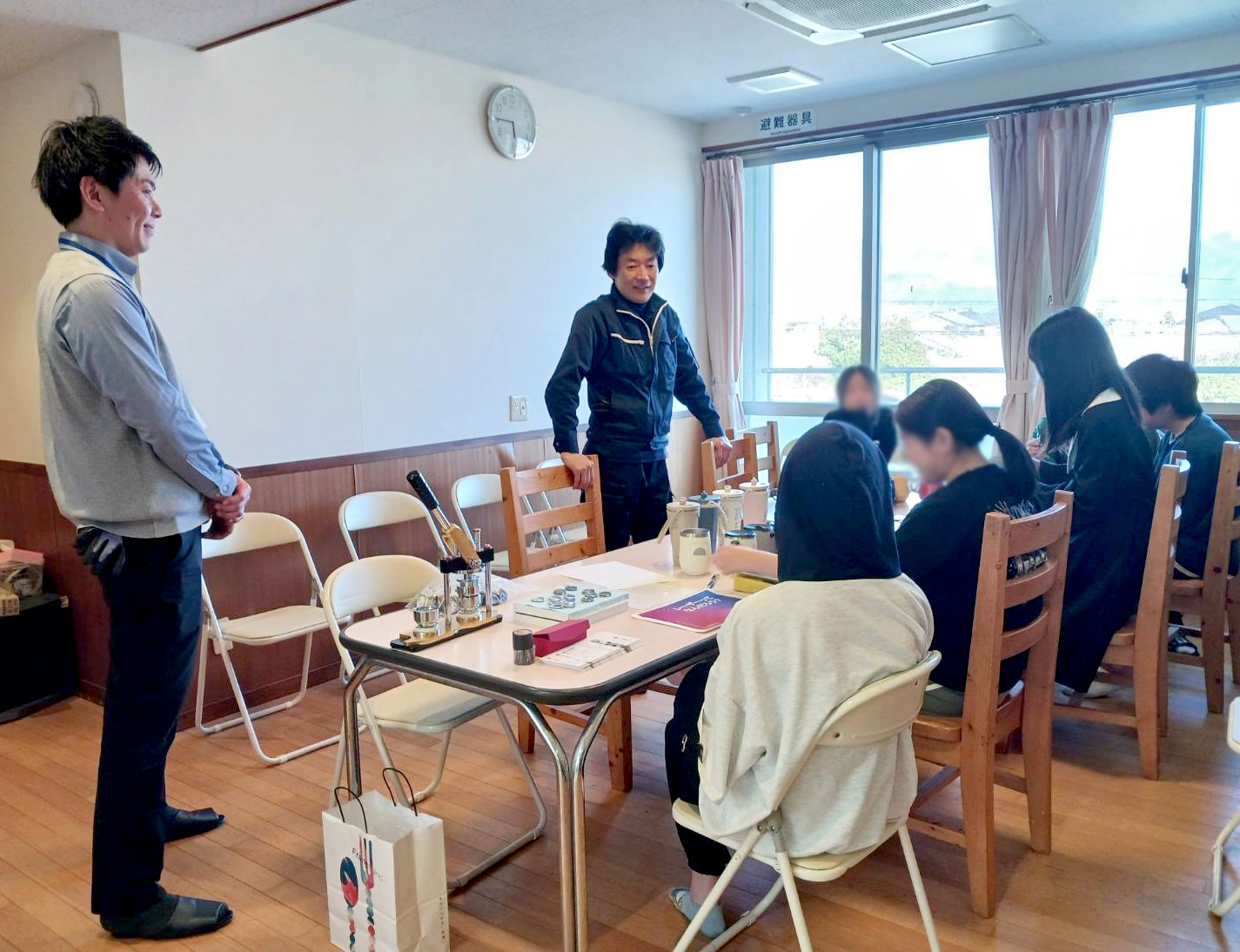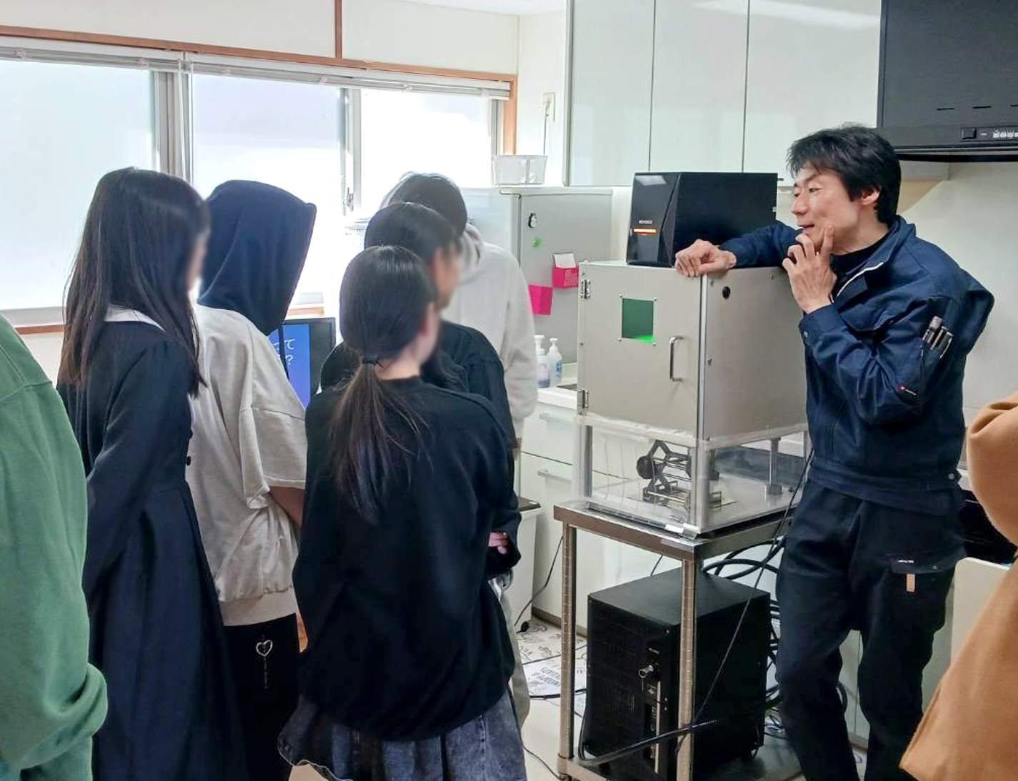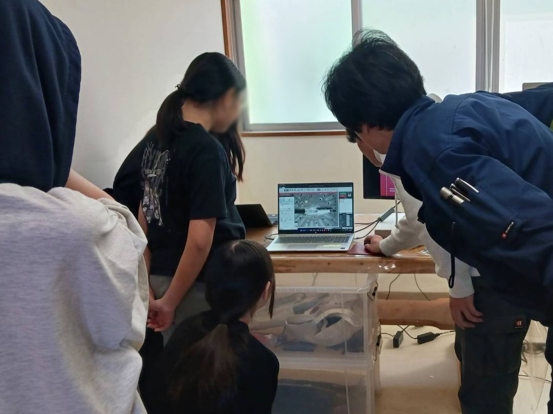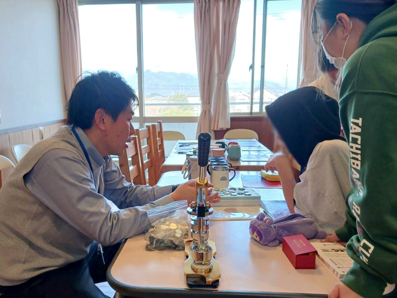 当初は緊張した様子も見られましたが、レーザー刻印機のデモンストレーションが始まると、目を輝かせながら機械の動きに見入る姿が印象的でした。初めて見るレーザー刻印の工程に歓声が上がり、次第に会話も増え、自然と笑顔が広がっていきました。